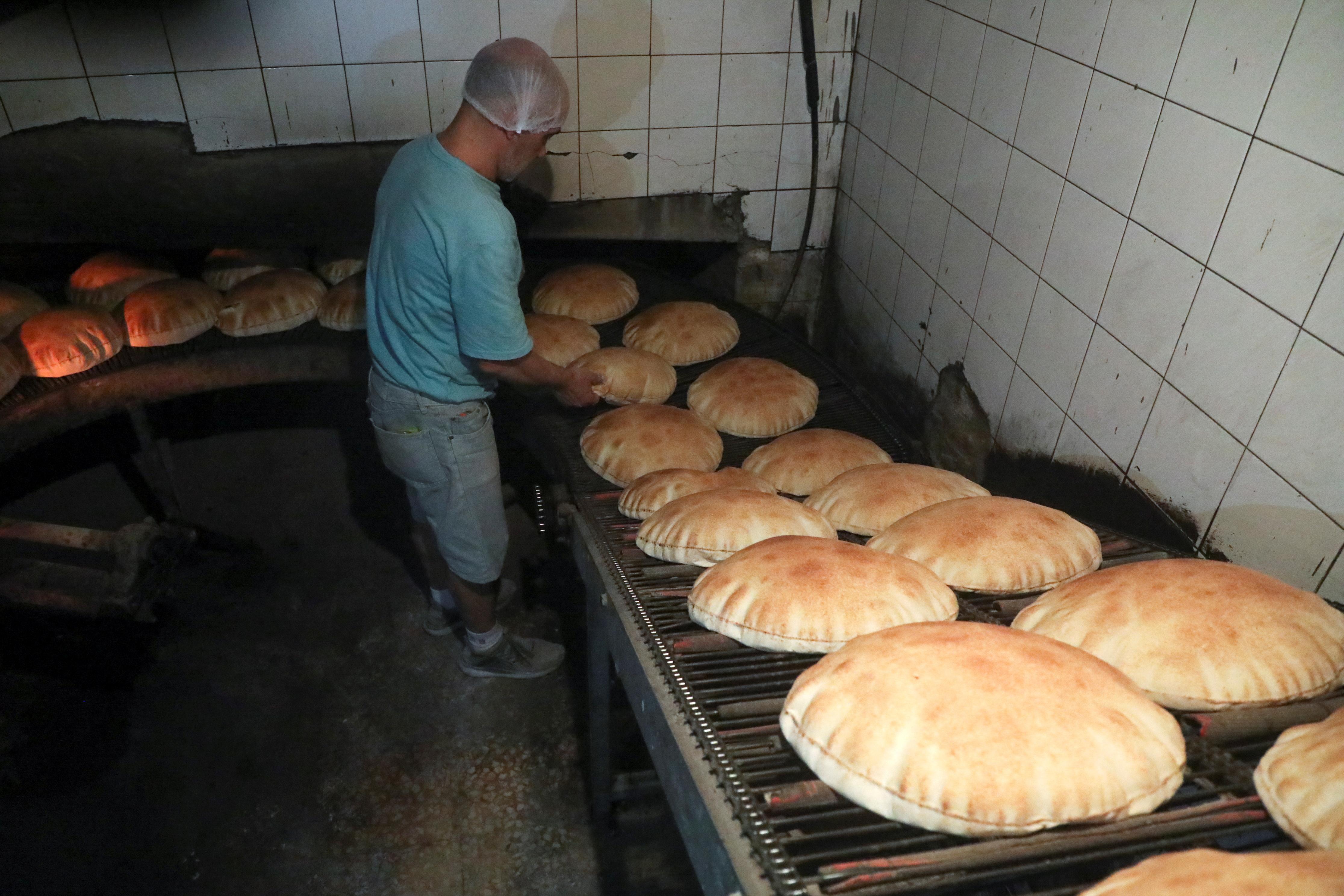 3月8日,黎巴嫩贝鲁特,工人站在面包店新鲜出炉的面包旁,受俄乌冲突影响,黎巴嫩物价飙升。/IC photo